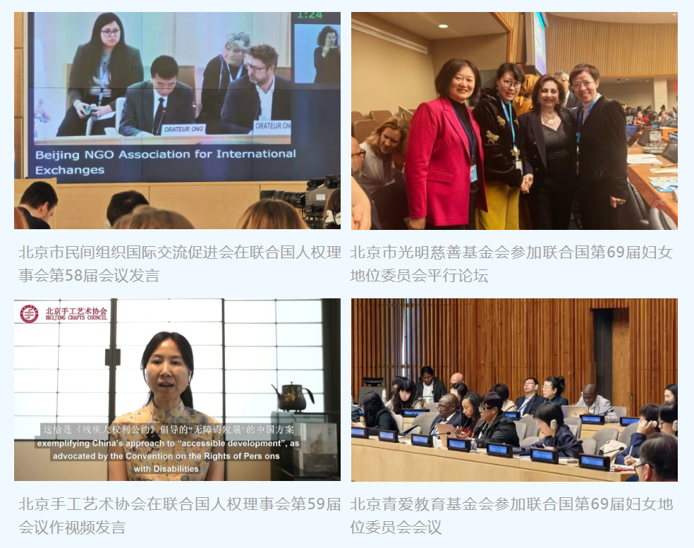 Since the beginning of this year, several Beijing-based social organizations, including the Beijing NGO Association for International Exchanges, Beijing Guangping Charity Foundation, Beijing Crafts Council, and Beijing Changer Education Foundation, have actively participated in international conferences under the UN framework, such as the Human Rights Council, the Commission on the Status of Women, and the High-Level Political Forum on Sustainable Development. Leveraging their consultative status, these organizations have shared China’s wisdom and Beijing’s approach to global challenges, contributing their insights to the advancement of the UN Sustainable Development Goals.