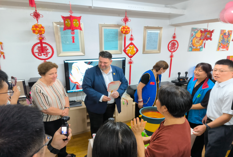 At the activity room of the service center for people with disabilities, Zafirov tried his hand at making a lacquer fan by dropping small amounts of lacquer in various colors into water and rapidly spinning the fan in it. He was so captivated by the experience that he repeatedly expressed his admiration. “This year is the Year of the Snake, so we’ve also made this snake-themed Siling Duixiu, a traditional Chinese art that combines silk applique with embroidery, for you as a keepsake,” said Ren Shuanghong, head of the service center and inheritor of the Siling Duixiu.