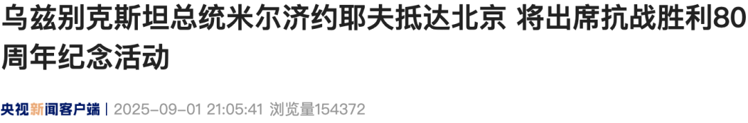 On the evening of September 1, Uzbek President Shavkat Mirziyoyev arrived in Beijing by high-speed train to attend the events commemorating the 80th anniversary of the victory in the Chinese People’s War of Resistance Against Japanese Aggression and the World Anti-Fascist War.