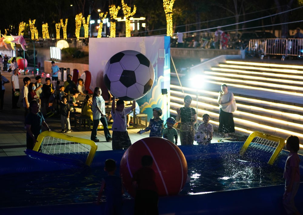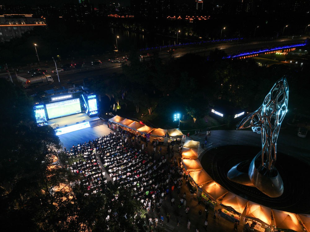 8月17日,在江蘇南京舉行的2025江蘇省城市足球聯賽第九輪比賽中,南京隊對陣鹽城隊。南京市在部分商場、街區等地設置觀賽“第二現場”,使用大屏幕同步直播賽事,同時設有游戲互動區、煙火市集區,讓球迷們度過歡樂時光。新華社記者 季春鵬 攝