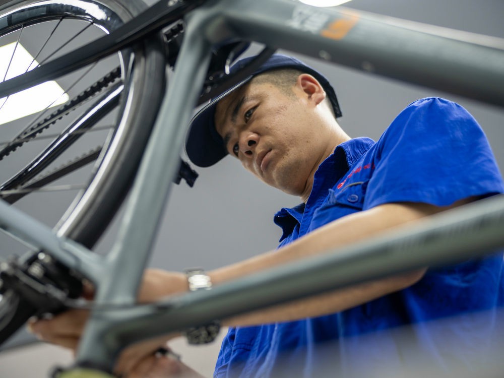 7月16日,在吉林化纖集團復材體育休閑裝備產業園,工人組裝碳纖維自行車車架。新華社記者 邵澤東 攝