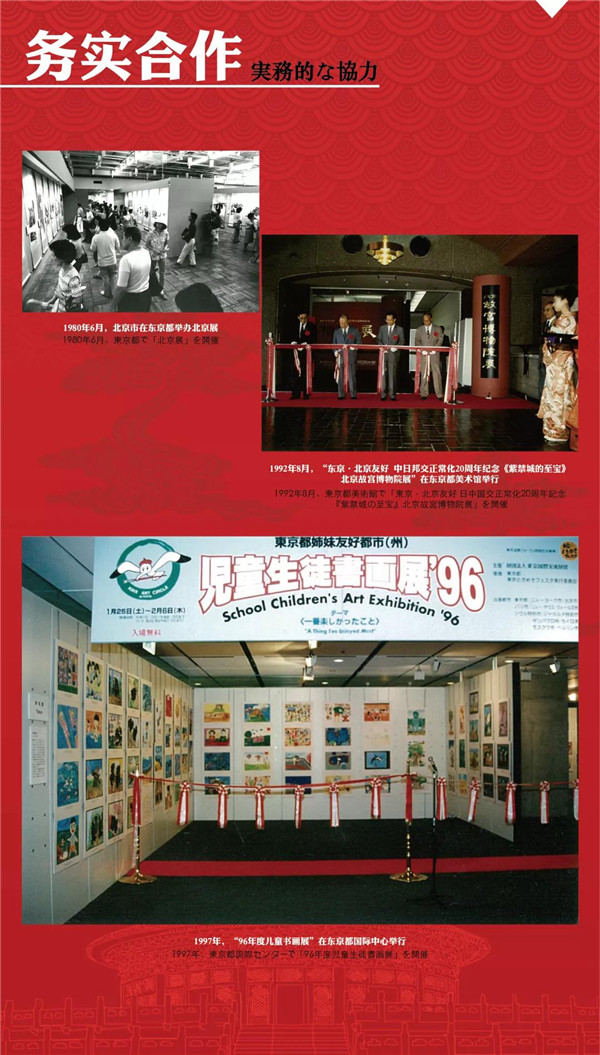 “紀念北京-東京締結友好城市關系40周年回顧展”用“官方交往”、“務實合作”、“民心相通”、“世代友好”四個篇章,展示了兩市40年來文化交流、科技創新、城市管理、奧運合作等方面的友好往來,彼此借鑒、相互促進,進一步推動兩市友城關系向縱深發展。
