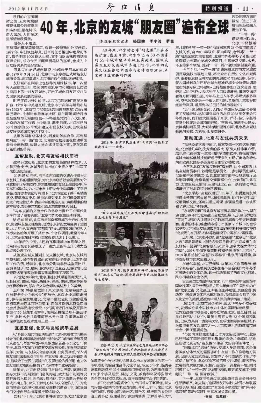 11月8日,《參考消息》特別報道整版刊發《40年,北京的友城“朋友圈”遍布全球》。讓我們來看看,北京的“朋友圈”里都有哪些精彩故事。