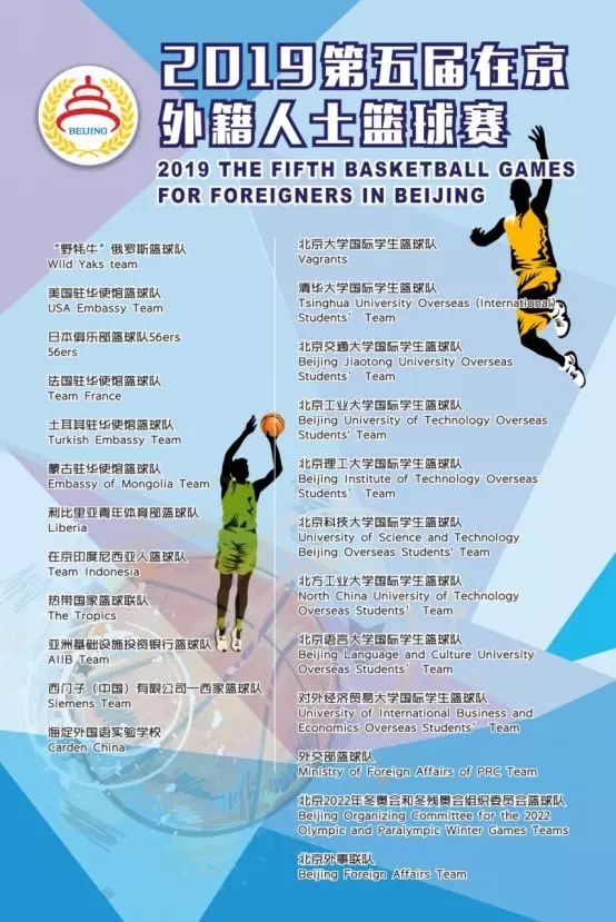 參賽隊員主要為俄羅斯、美國、法國、土耳其、日本等國駐華使館,在京外資企業、國際學校、高等院校等機構的外籍人士。外交部籃球隊、北京冬奧組委籃球隊,以及由市外辦干部為主體的北京外事聯隊參賽。