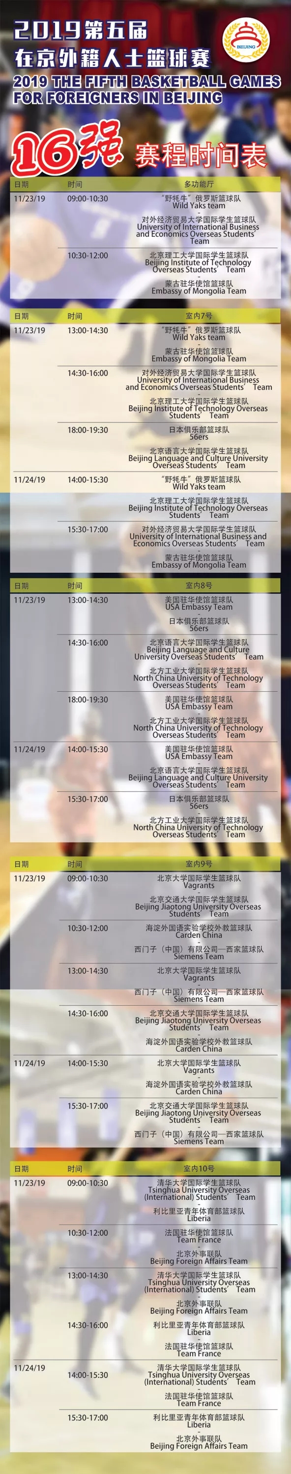 11月16日、17日兩天,外交部籃球隊與北京語言大學留學生籃球隊;“野牦?!倍砹_斯籃球隊與北京外事聯隊等16支球隊共進行了20場精彩的比賽。各球隊隊員們狀態良好,中投、三分球接連得分!各隊的拉拉隊賣力地為場上的隊員叫好助威,場上場下一起享受籃球運動的快樂。