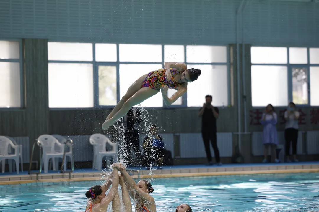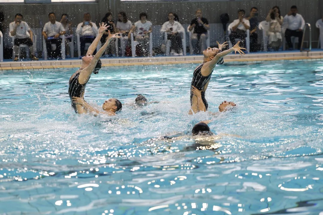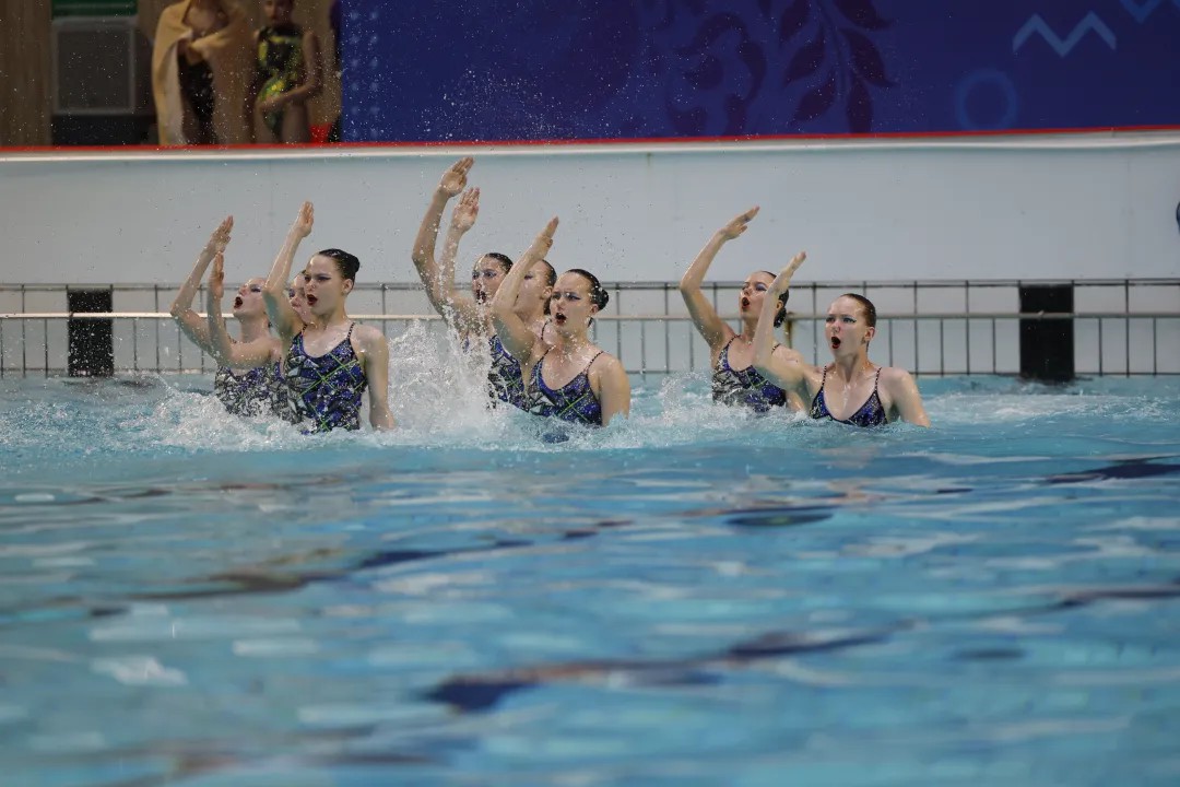 交流演出中,莫斯科市表演了《燃動爵士》《優雅的貓》《機器人男孩X》等7個曲目,北京市表演了《鷹》《水中勇士》《啟航》4個曲目。兩市隊員們靈動的身姿、兼具美感與力量的表演,如同展開一幅動態畫卷,現場雙方隊員相互點贊,驚嘆聲、掌聲不斷。表演結束后,雙方花泳隊員自發上臺,手拉手一起歡呼著躍入水中,青春的笑臉在泳池中綻放,感染了在場的每一個人。