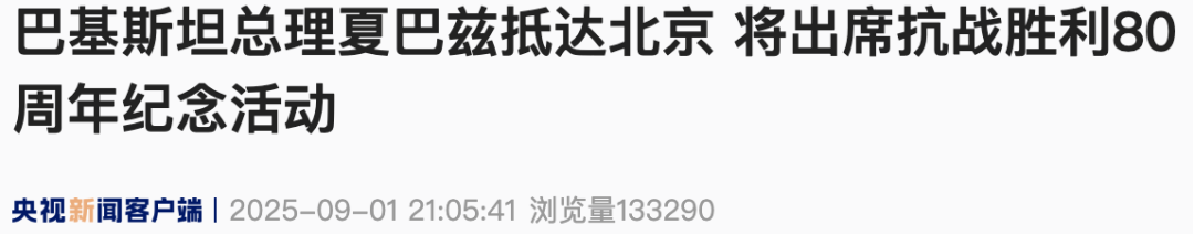 9月1日晚,巴基斯坦總理夏巴茲乘高鐵抵達北京,將出席中國人民抗日戰爭暨世界反法西斯戰爭勝利80周年紀念活動。