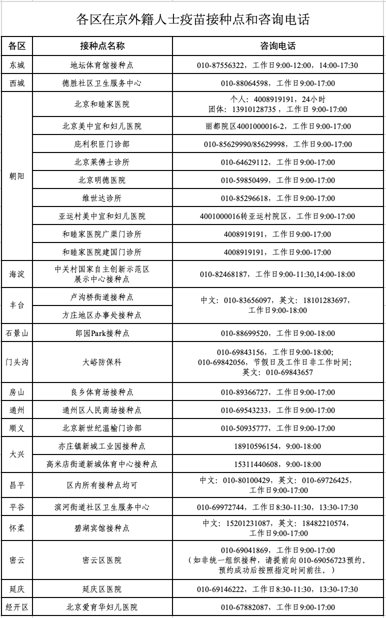 在京外籍人士疫苗接種點名單
