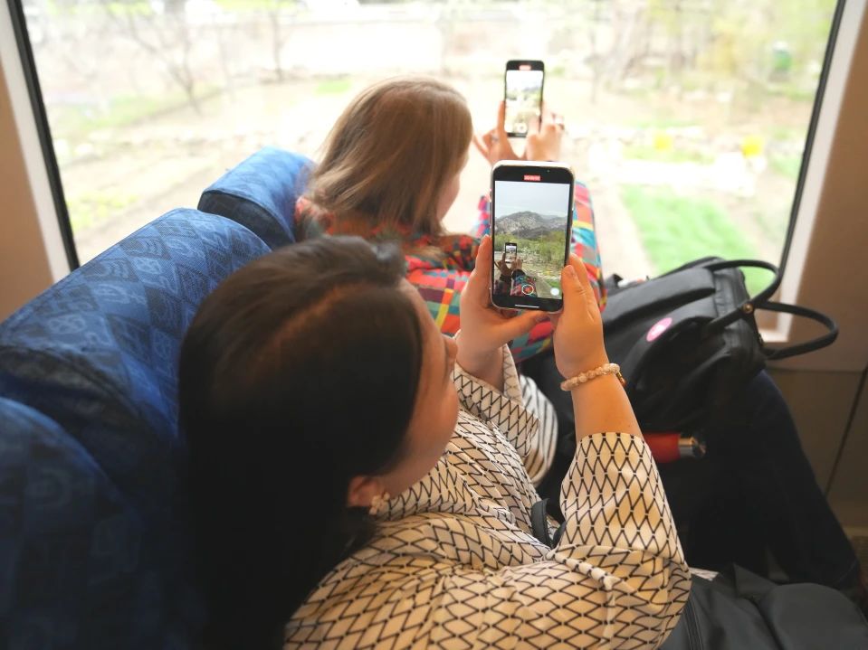 隨著使用全新“花?!蓖垦b的S2線列車從黃土店站緩緩駛出,這次春日之行正式開始。外交官和外國記者們對此十分期待,大家興奮地交流,車廂內充滿歡聲笑語。列車行至南口至八達嶺段,兩側山坡春花漸密,引得大家紛紛舉起手機拍照打卡。秘魯駐華大使館副館長艾麗卡·里薩爾多沉浸在這一美好的體驗中,“車窗外山花爛漫,遠處還可以依稀看到蜿蜒的長城,沿途美不勝收的風景令人愉悅?!?/p>
