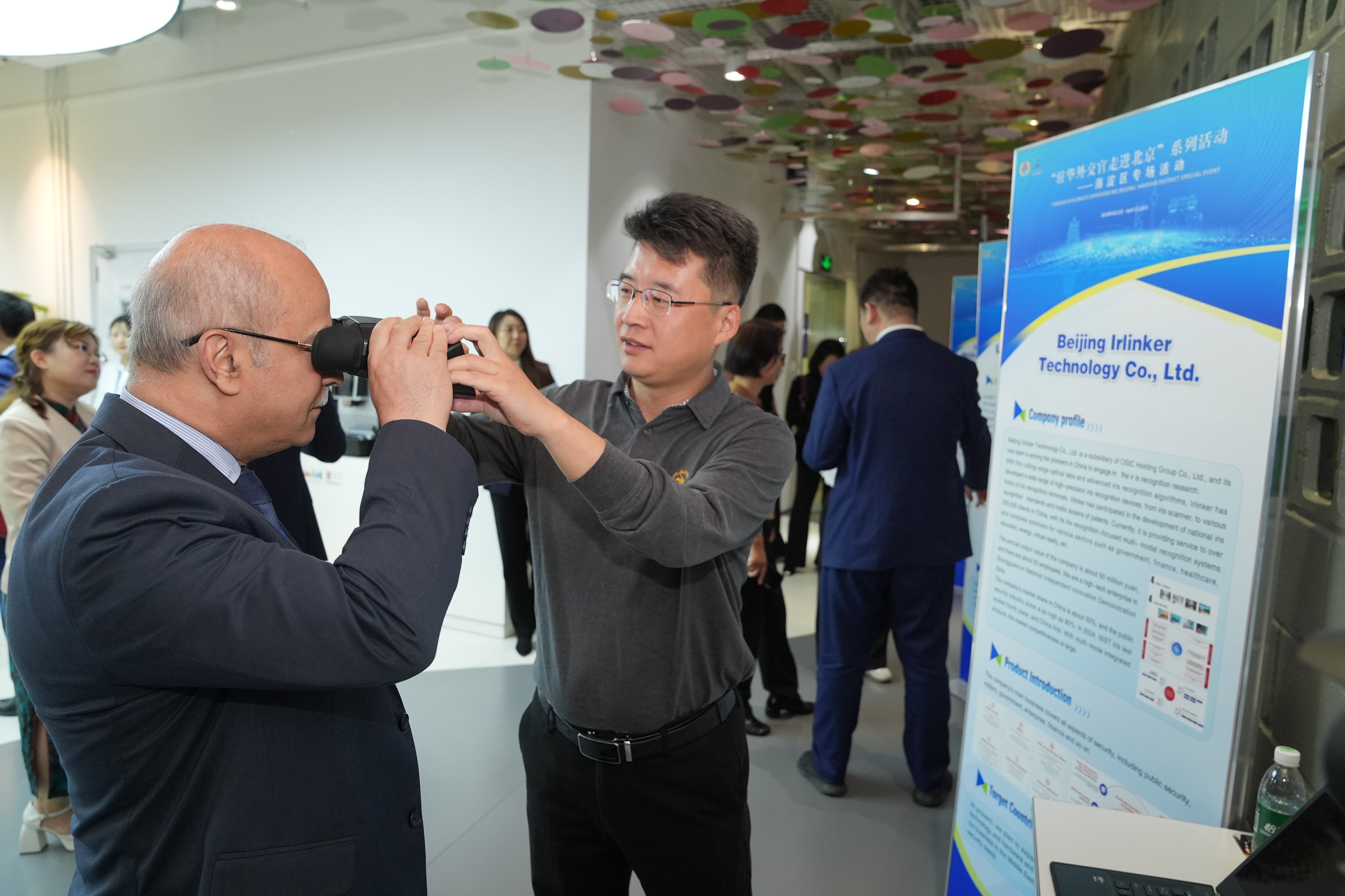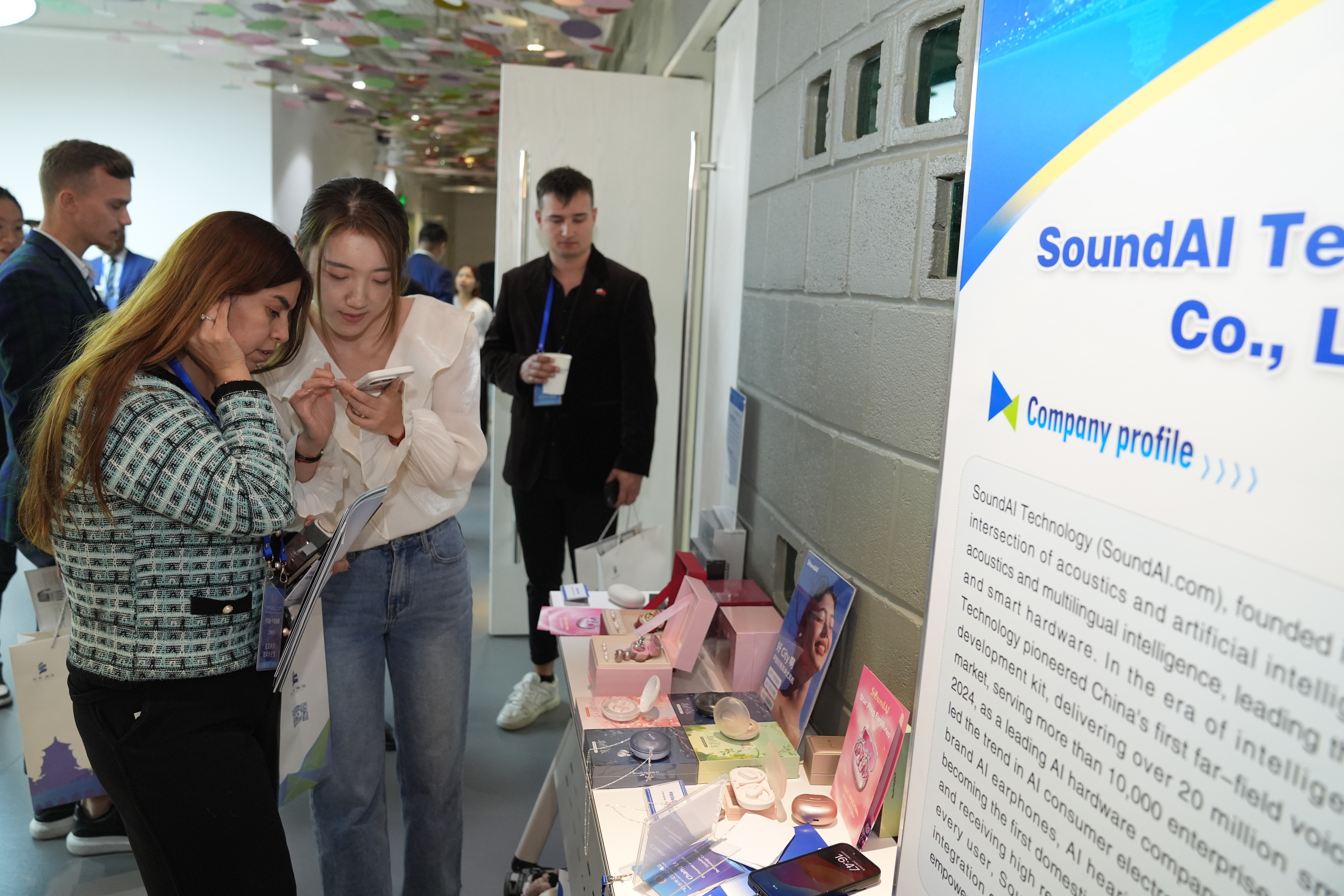 現場還展示了海淀區23家科技創新企業的發展情況。機器人、無人機、人工智能、沉浸式VR、智能硬件、生物識別、生物醫藥、工業軟件技術…琳瑯滿目的科技產品和展示互動,讓現場宛如“迷你科技博覽會”。外交官們穿梭于其間,或俯身觀摩設備運行原理,或舉起鏡頭記錄創新成果,或與相關科技企業負責人熱切交流,碰撞合作意向。其中,聲智科技現場展示的AI耳機,能夠支持66種語言實時翻譯,展品被一搶而空。